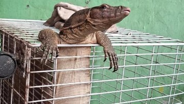 Seeokor biawak nyangkut di kadang kucing milik warga di Depok. Warga lalu meminta bantuan petugas damkar untuk mengeluarkan biawak tersebut.