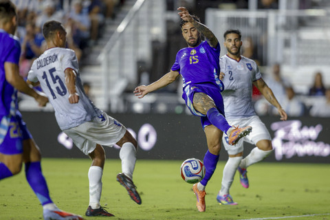 Pemain Timnas Argentina Gonzalo Montiel menendang bola ke arah gawang Timnas Puerto Rico pada pertandingan persahabatan di Stadion Chase, Florida, Amerika Serikat, Selasa (14/10/2025). Foto: Chris Arjoon/AFP