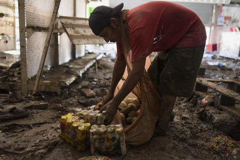 Warga berjalan menyelamatkan minuman dalam botol dari lantai berlumpur usai banjir di salah satu supermarket di Alamo, negara bagian Veracruz, Meksiko, Senin (13/9/2025). Foto: Rolando Ramos/Reuters
