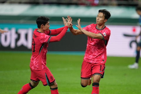 Pemain Korea Selatan Eom Ji-sung disambut oleh Son Heung-min setelah mencetak gol pembuka dalam pertandingan persahabatan internasional antara Korea Selatan dan Paraguay di Stadion Piala Dunia Seoul, Korea Selatan, Selasa (14/10/2025). Foto: Lee Jin-man/AP Photo
