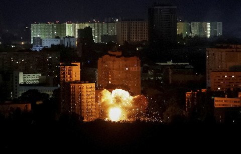 Sebuah ledakan dari sebuah pesawat tak berawak terlihat saat serangan pesawat tak berawak dan rudal Rusia, di tengah serangan Rusia ke Ukraina, di Kyiv, Ukraina, Senin (23/6/2025). Foto: Gleb Garanich/REUTERS