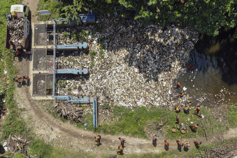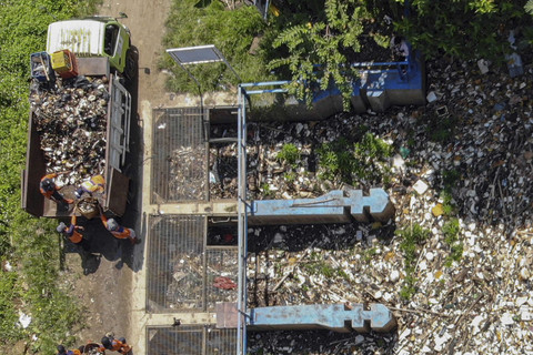 Foto udara petugas Dinas Lingkungan Hidup (DLH) Kabupaten Bogor membersihkan tumpukan sampah di aliran irigasi Sungai Cikaret, Cibinong, Kabupaten Bogor, Jawa Barat, Selasa (14/10/2025). Foto: Yulius Satria Wijaya/ANTARA FOTO