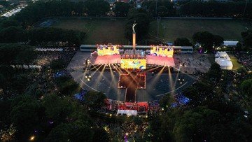 Malam puncak HUT ke-498 Jakarta di Lapangan Banteng, Minggu (22/6). Gubernur DKI Pramono pun tak segan diajak bernyanyi oleh vokalis Juicy Luicy.