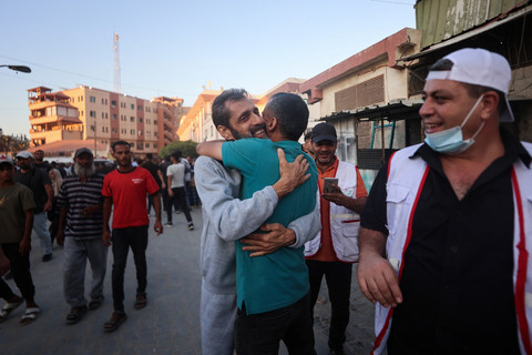 Seorang warga Palestina yang dibebaskan dari penjara Israel memeluk keluarganya saat tiba di luar rumah sakit Nasser, Khan Younis, Jalur Gaza, Senin (13/10/2025). Foto: Omar AL-QATTAA / AFP