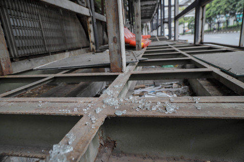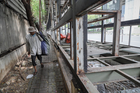 Pantauan kumparan pada Senin (13/10) pagi, halte tersebut tampak rusak parah. Pelat besi di lantai dan tangga jembatan penyeberangan orang (JPO) hilang, menyisakan rangka besinya.