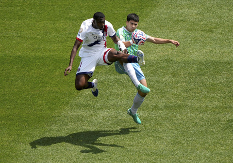 Pemain Seattle Sounders, Jon Bell, beraksi dengan pemain Paris St Germain, Senny Mayulu pada pertandingan Piala Dunia Antarklub antara Seattle Sounders vs Paris St Germain-Lumen Field, Seattle, Washington, A.S, Selasa (24/6/2025). Foto: Agustin Marcarian/REUTERS