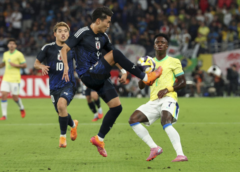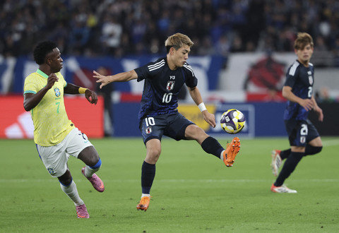 Ritsu Doan dari Jepang beraksi bersama Vinicius Jr. dari Brasil pada pertandingan persahabatan antara Jepang vs Brasil di Stadion Tokyo, Tokyo, Jepang, Selasa (14/10/2025). Foto: Kim Kyung-Hoon/REUTERS