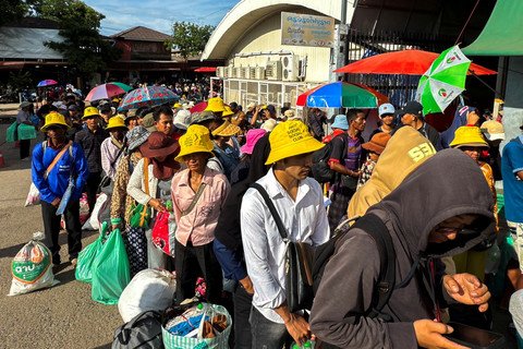 Di perbatasan Khlong Luek, provinsi Sa Kaeo, warga Kamboja antre untuk keluar wilayah Thailand. Dengan membawa barang-barang berharga, mereka berbondong-b0ndong memadati pos perbatasan.