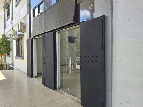 Pintu besi setinggi lebih dari 2 meter dengan ketebalan sekitar 4 sentimeter itu dipasang menutupi akses utama. Berdaun ganda dan berwarna hitam pekat, pintu tampak kontras dengan pilar marmer besar yang menopangnya, sehingga terlihat kokoh dan menutup rapat hampir seluruh area masuk ke lobi utama.