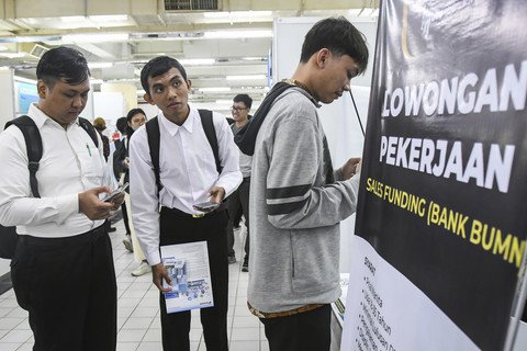 Sejumlah warga mencari informasi lowongan pekerjaan saat bursa kerja di Thamrin City, Jakarta, Rabu (12/3/2025). Foto: Sulthony Hasanuddin/ANTARA FOTO