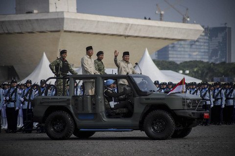 Presiden Prabowo saat meninjau pasukan dalam peringatan Hari Ulang Tahun (HUT) ke-80 Tentara Nasional Indonesia (TNI) di Lapangan Silang Monumen Nasional (Monas), Jakarta Pusat, Minggu (5/10/2025). Foto: Jamal Ramadhan/kumparan