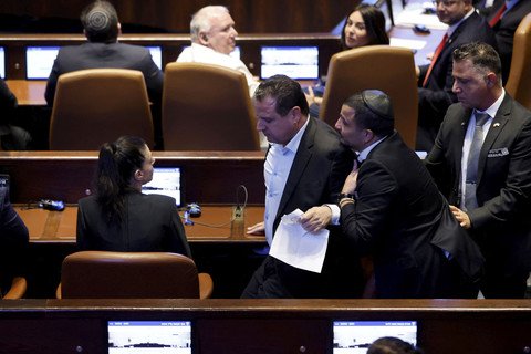 Anggota Knesset Ayman Odeh dikeluarkan dari aula setelah mengangkat spanduk saat Presiden AS Donald Trump berpidato di hadapan Knesset, parlemen Israel di Yerusalem, Senin (13/10/2025). Foto: Chip Somodevilla/Pool via REUTERS