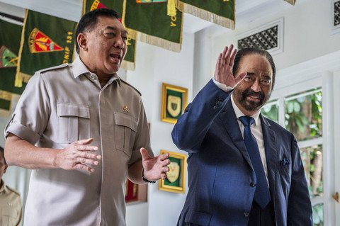 Menteri Pertahanan (Menhan) Sjafrie Sjamsoeddin menerima kunjungan Ketua Umum NasDem Surya Paloh di kantor Kementerian Pertahanan (Kemhan), Jakarta, Rabu (15/10). Sjafrie juga dijadwalkan akan bertemu PKS pada Jumat (17/10).